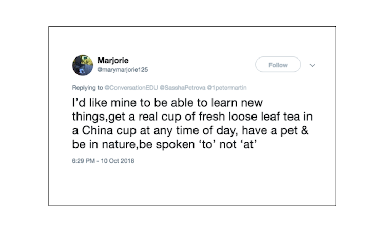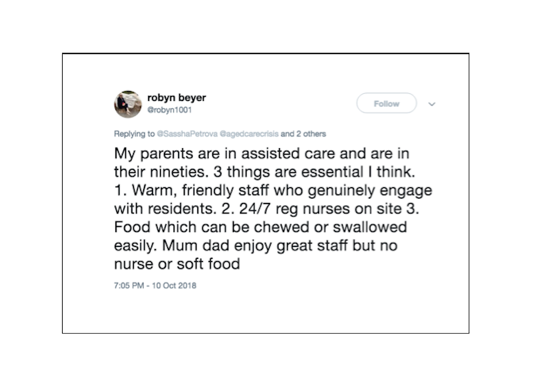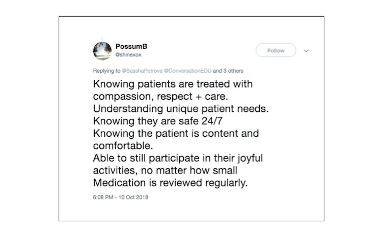 Everyone has their own idea of what quality of care and quality of life in residential aged care may look like. The Conversation asked readers how they would want a loved one to be cared for in a residential aged care facility. What they said was similar to what surveys around the world have consistently found.