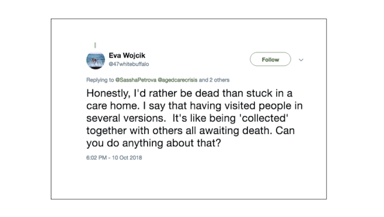 A mature judgment to determine good quality requires us to recognise that many people have an instinctive and distressingly bleak view of ageing, disability, dementia and death. Some people express this as death being preferable to living in aged care, as the tweet below shows.
