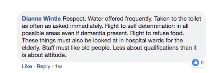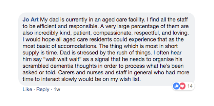 Time is a factor in aged care, as staff often don’t have enough time to spend with each resident. A recent ABC Four Corners investigation into quality in aged care found personal care assistants had only six minutes to help residents shower and get dressed. No wonder, then, that staff often don’t have the personal time to be able to spend with residents who need life to be a little slower, as the Facebook comment below shows.